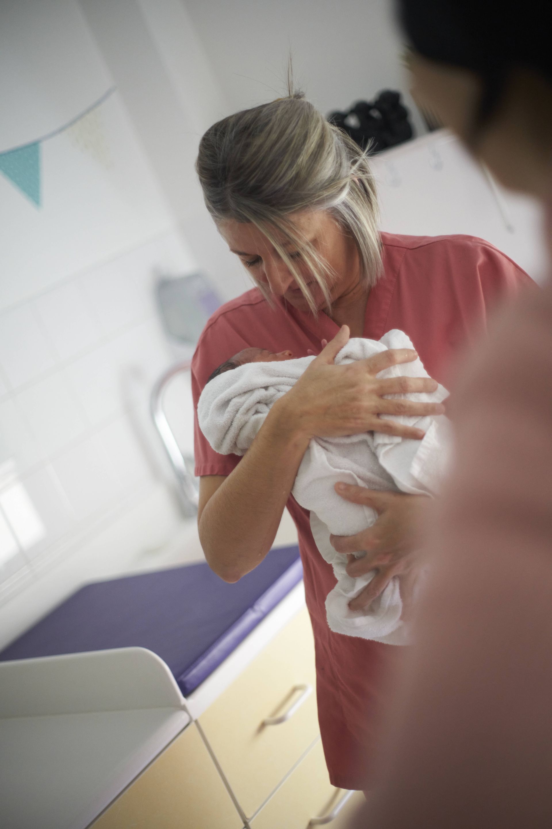 Une sage-femme, assistée d’une auxiliaire de puériculture, prend en charge, de jour comme de nuit, les mères et les nouveau-nés. - Un secteur naissance comprenant : une salle de consultations de fin de grossesse (monitorings), 1 chambre de pré-travail, 1 salles de naissance, 1 salle de naissance physiologique "Nature". Pour les nouveaux nés : une salle de réanimation bébé et une salle de surveillance pour photothérapie et autres. Les salles de naissance sont situées à proximité immédiate du bloc opératoire qui comporte une salle dédiée aux césariennes.